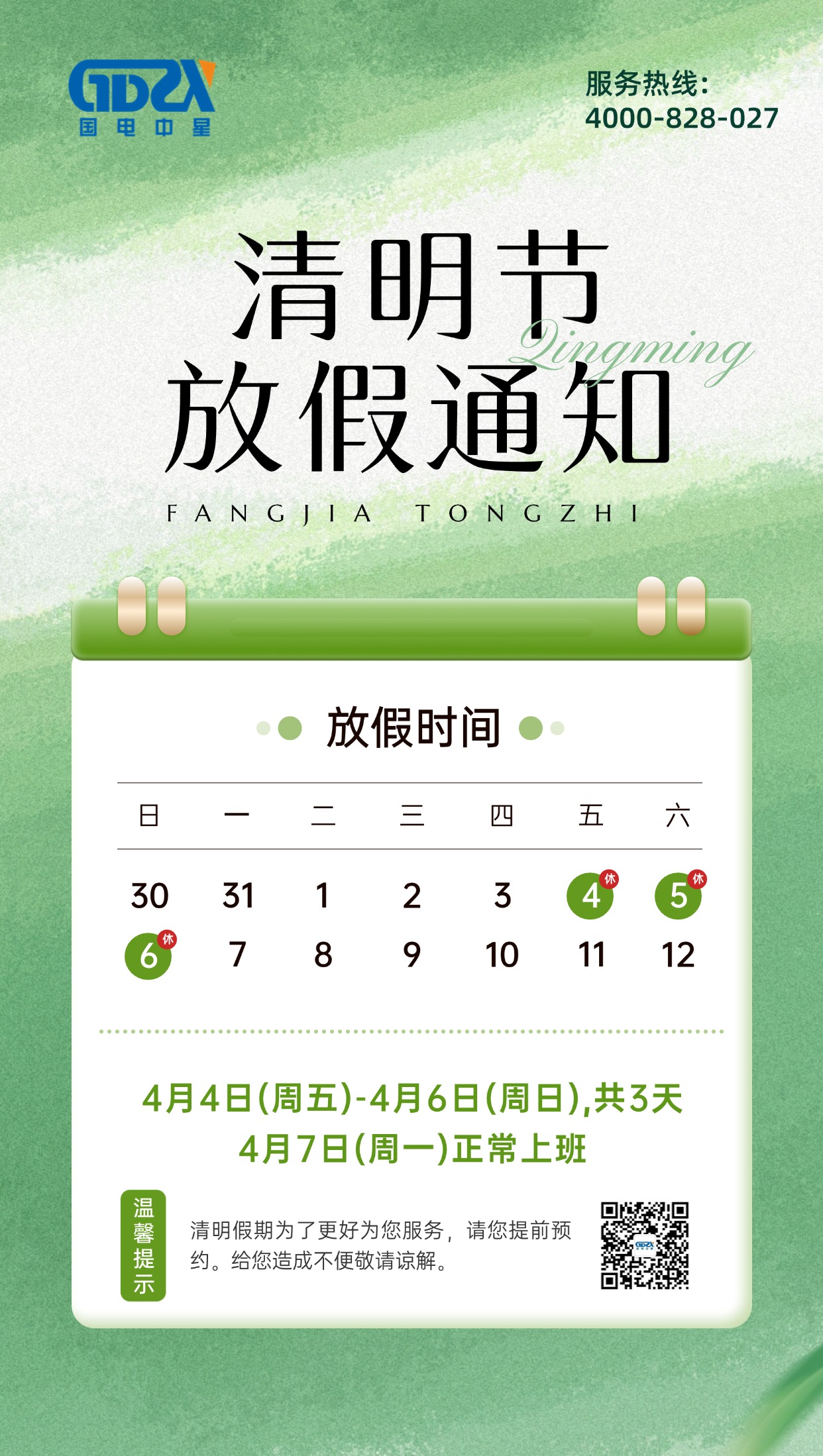 國電中星2025年清明節(jié)放假通知清明節(jié)是中華民族的重要傳統(tǒng)節(jié)日,歷史上一度成為僅次于春節(jié)的盛大節(jié)日。在傳統(tǒng)社會中,清明節(jié)的節(jié)期持續(xù)時間較長(五六天到十幾天,各地各時代不等),一方面是掃墓祭奠、懷念離世親人的節(jié)日,一方面是踏青嬉游、親近大自然的節(jié)日。直到今天,清明節(jié)仍然是中華民族包括海外華人的重要節(jié)日之一 。親愛的國電中星小伙伴:清明將至,萬物春和。根據(jù)國家節(jié)假日安排,結(jié)合單位工作實際,現(xiàn)將2025年清明節(jié)放假安排通知如下:一、放假時間1、...